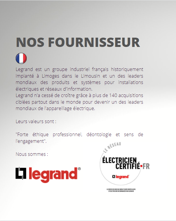 Nous faisons partie du réseau d’électricien certifié LEGRAND, tous nos chantiers électriques vous sont fournis avec du matériel LEGRAND, marque française et gage de qualité. Notre équipe est régulièrement informée des nouveautés et formée par la marque.